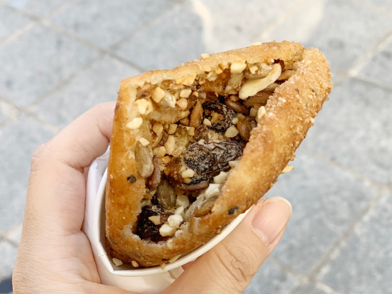 un pancake ai semi (di girasole, di zucca e di pinoli) farcito con un ripieno di cannella e zucchero di canna.